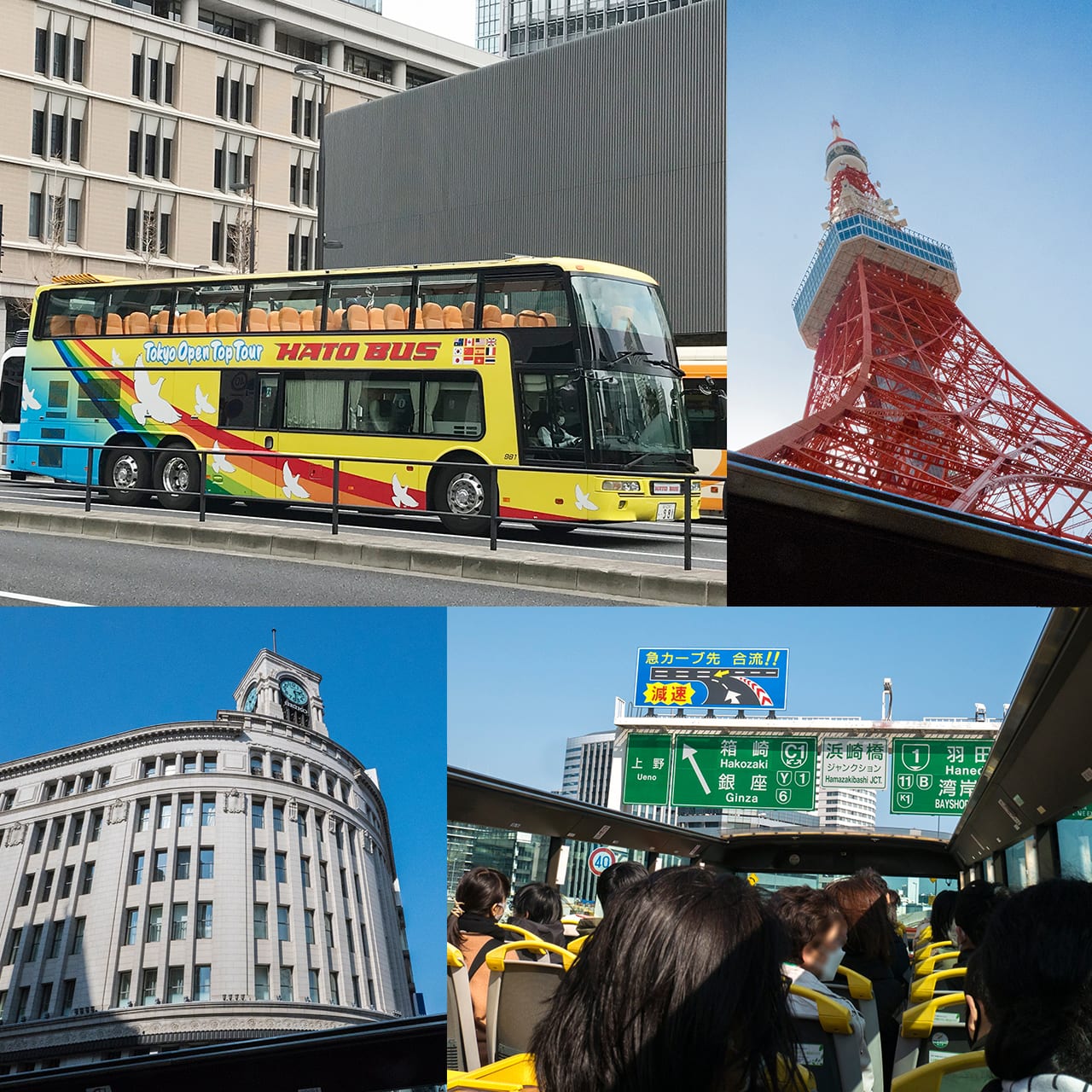 はとバスの「東京オープントップツアー」には数種類のコースが用意され、都心をめぐるほか、夜景を楽しむナイトドライブや、桜の花を2階席から間近に見られる季節限定コースなどがあります。もちろんどのツアーもバスガイドさんの案内つきです。