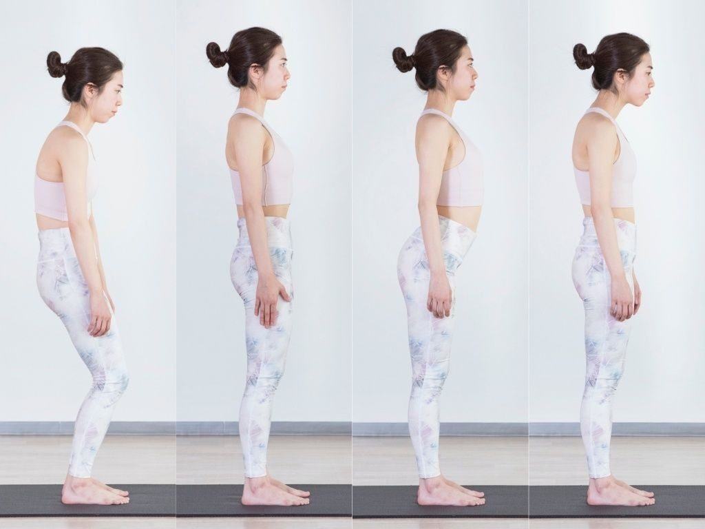 答えは「左から2番目」。ピラティスの基本姿勢「ニュートラル・ポジション」と呼ばれる姿勢になります。ちなみに左端は骨盤が後ろに倒れて背中が丸まってしまった姿勢、右から2番目は骨盤が前に出て反り腰になった姿勢、そして右端は首が前に出てしまった姿勢となり、これらの姿勢が定着してしまうと代謝低下へとつながっていくのです。それでは、この“痩せる姿勢”となる【ニュートラル・ポジション(立ち姿勢)】の作り方をチェックしてみましょう。