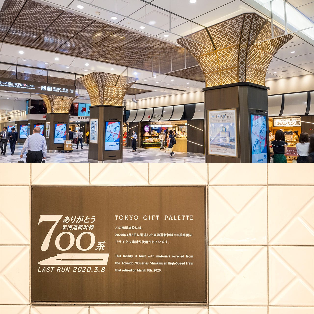 東京ギフトパレット内には、東海道新幹線700系のリサイクル建材が使われていることを記したプレートが6枚設置されています。700系は1999年の営業運転開始から、N700系の車両で統一されることになった2020年3月まで運用されました。