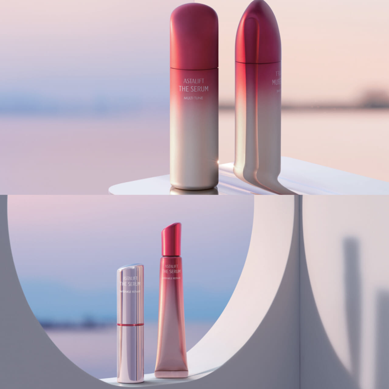 ▲(左から)アスタリフト ザ セラム マルチチューン<薬用多機能美容液>(医薬部外品)、スタリフト ザ セラム リンクルリペア(朝用)<薬用シワ改善美容液>(医薬部外品)、スタリフト ザ セラム リンクルリペア(夜用)<薬用シワ改善美容液>(医薬部外品)
