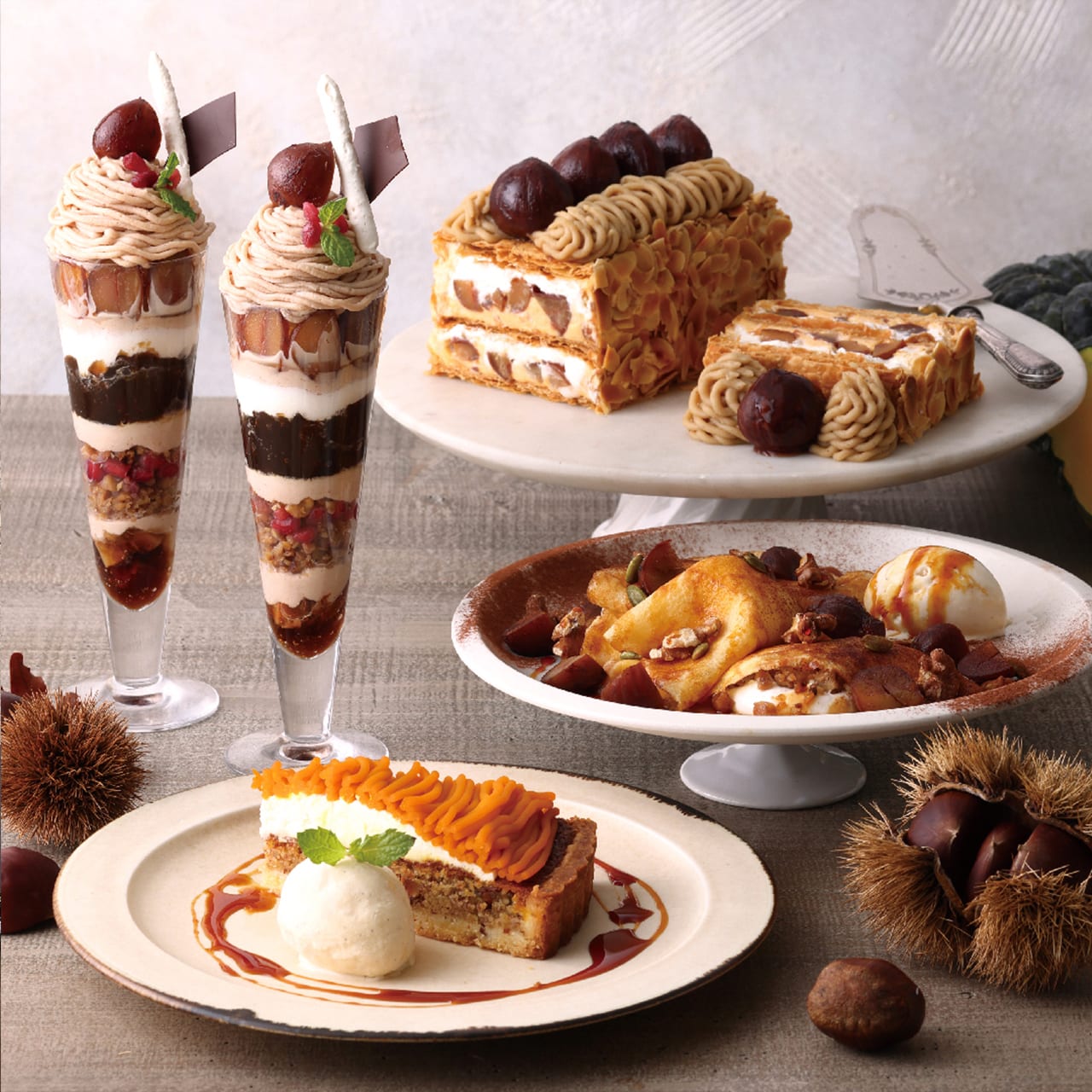 今年のフェアも4種類のマロンスイーツを用意。期間を通じてパフェとパイが用意されるほか、新作のクレープは10月15日(土)まで。翌日の10月16日(日)からのタルトも1カ月間の限定です。とりわけパフェとパイはマロンクリームが異なっていて、食べ比べると同じ栗でも違う味わいや食感を楽しめます。