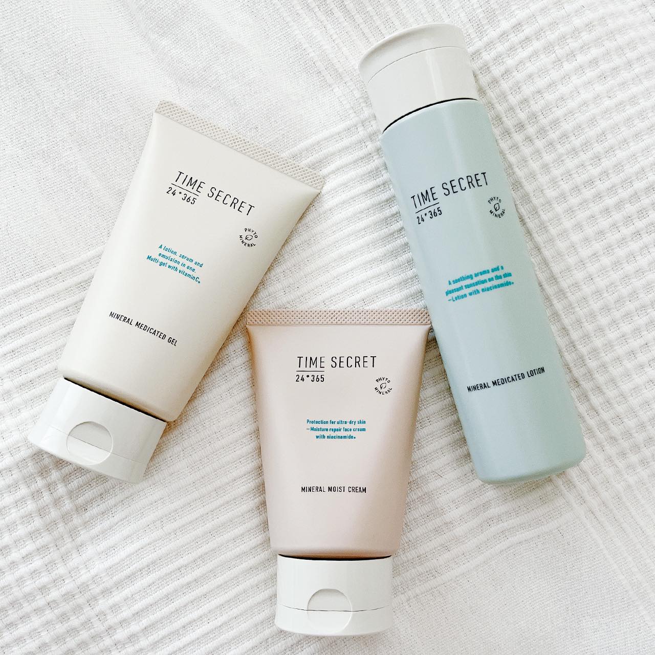 今回は【タイムシークレット】のミネラルスキンケアシリーズから、「ミネラル 薬用ローション」、「ミネラル 薬用ジェルセラム」、「ミネラル モイストバリアクリーム」の3アイテムを紹介します。
