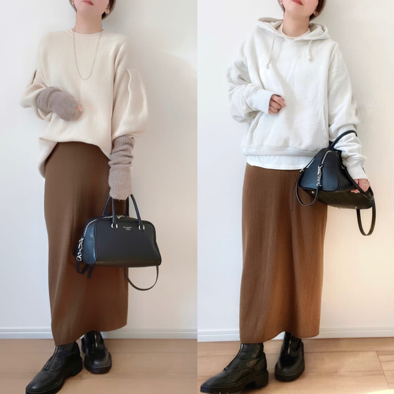 一見、体のラインを広いそうなタイトシルエットですが、バツグンな伸縮性と繊細なリブ編みがスマートに見せてくれ、ノンストレスな履き心地が魅力。さらに、リブを柄のように角度を付けて編み立てられた腰周りのデザインが、体のラインをスッキリみせてくれるような視覚効果を演出してくれるのもさすがです。それではデイリーに着回したいリアルコーデを紹介します。