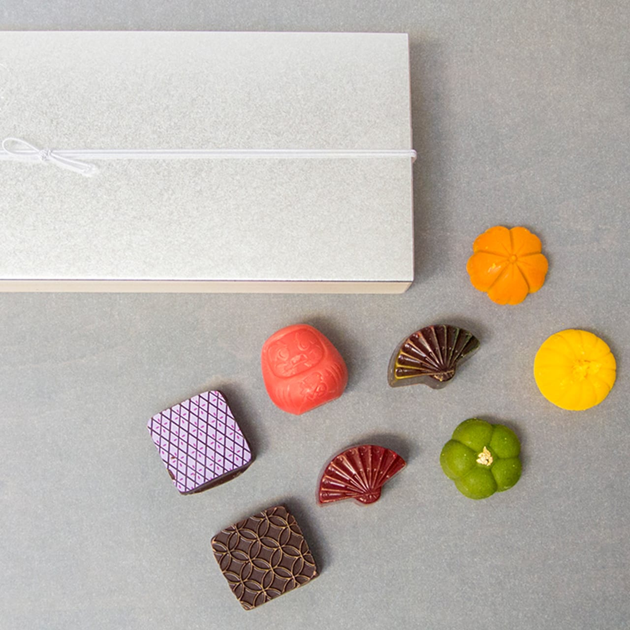 梅や菊の花、だるまや末広がりの扇など縁起ものチョコレート8粒の詰め合わせ「舞い扇」。木箱を開けた瞬間に、その美しさに見とれてしまいます。チョコレートの風味や甘味はもちろん、酸味や苦味など素材の特徴を引き出した味を満喫できるコレクションです。