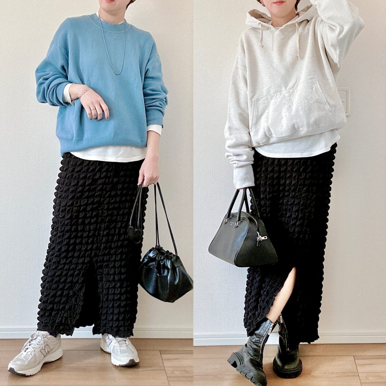 何にでも合わせやすい黒のタイトスカート。とはいえ、これから薄着になる季節にはちょっと物足りなさを感じることもあるでしょう。そこで狙い目なのが、ぽこぽこの素材感が可愛い【ポップコーン素材のスカート】です。