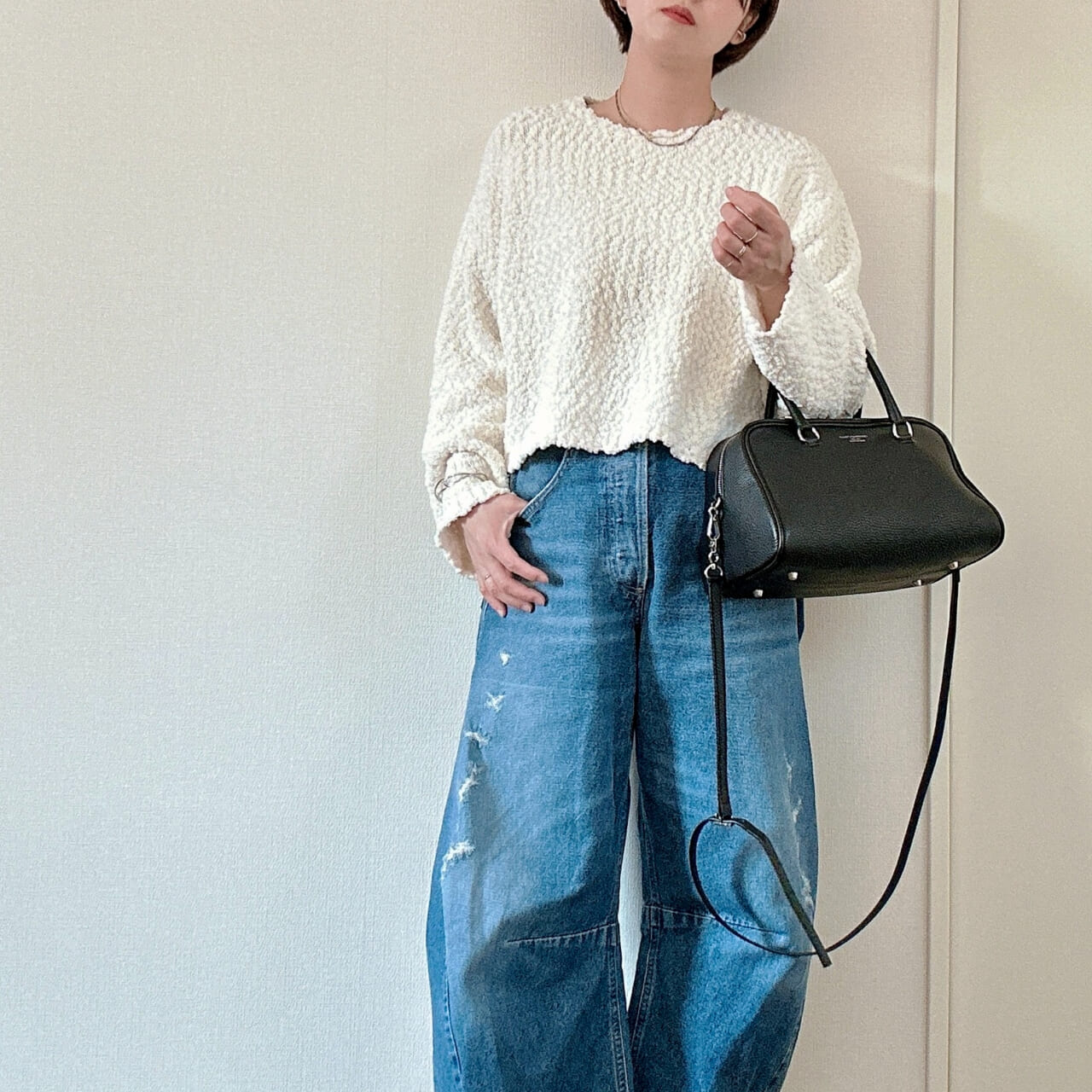 もこもことした表情がフェミンさを醸してくれて、明るめのホワイトカラーが春らしさたっぷり。思わず触れたくなるようなふわっと柔らかな着心地に、クロップド丈が着るだけで簡単に旬のバランスも叶えてくれます。
