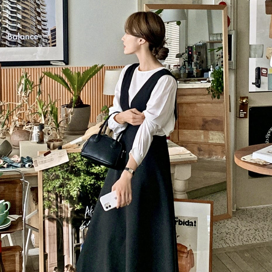 ジャンパースカートタイプのワンピースは、シャツやブラウスをインすることで、程良く大人っぽさときちんと感を演出しましょう。
