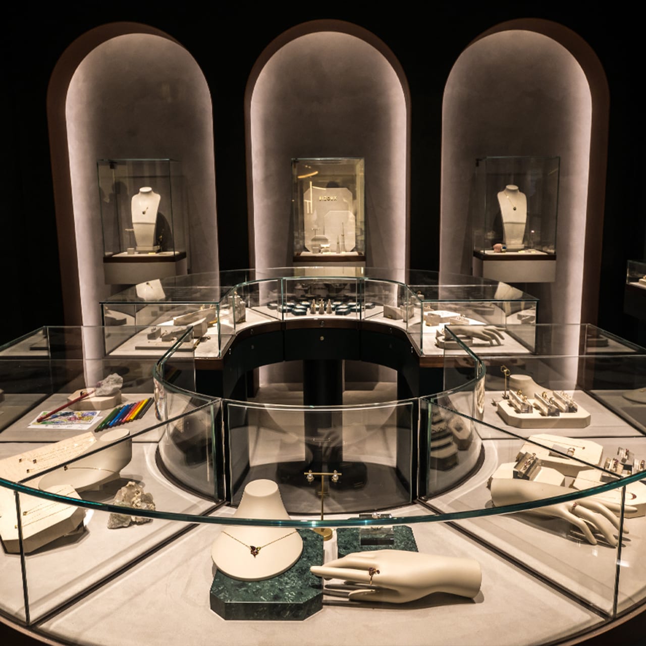 ▲入口の中央にある、メリーゴーラウンドを思わせる円形のショーケースには、誕生石が月別に展示され、選びやすくなっています