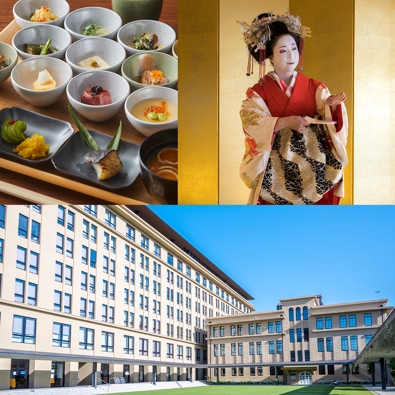 平成5年(1993年)に閉校した築95年の立誠小学校をリノベーションした【THE GATE HOTEL(ザ・ゲートホテル)京都高瀬川 by HULIC】。非日常を味わえる館内の造りはもちろん、8階にあるロビーやレストラン、バーからは、東山まで見渡せるパトラマに感嘆。能楽師や嶋原太夫のイベントなども毎月開かれる、京都に魅了されるホテルです。