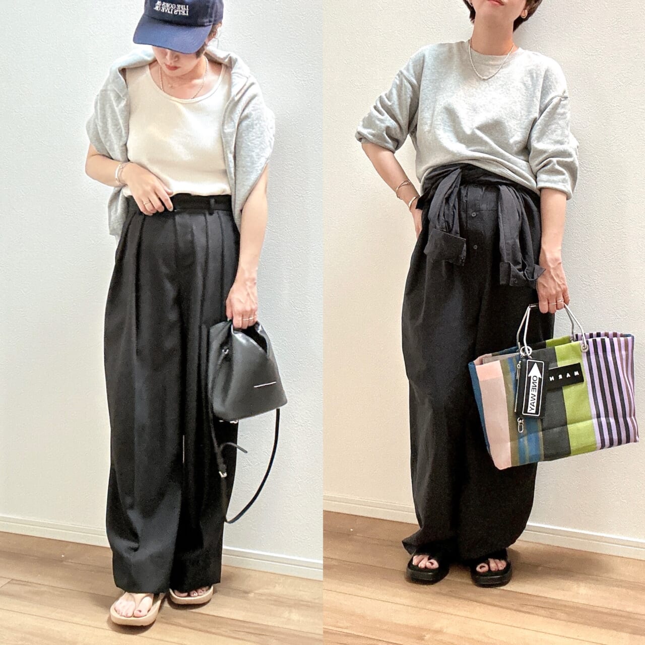 スウェットトップスはどうしてもカジュアル感が強めになりがちなので、アクセサリーは必須。カジュアル感をやわらげて簡単に大人感を高めることができます。また、春に大活躍していたオールインワンも、上を脱いで腰巻きしたパンツだけの着こなしなら移行期にもピッタリ。スウェットは短丈とリブ仕様の裾なので、ウエストアウトしても、もたつくことなく着られるのも嬉しいポイントです。