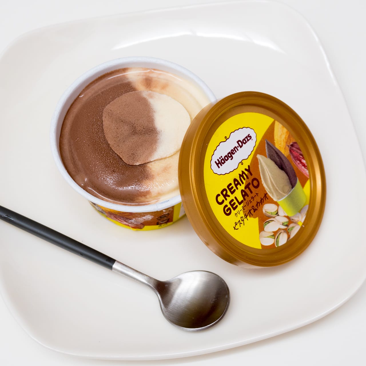 2位は、ミニカップ CREAMY GELATO『ピスタチオ&カカオ』。ピスタチオとカカオが半分ずつ2層になっています。