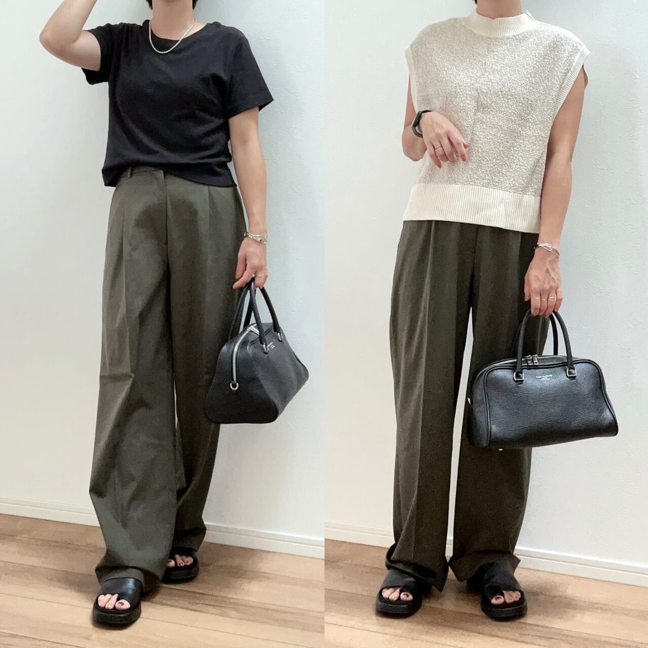 ミリタリーっぽいイメージのあるカラーですが、きれいめに履けるタックワイドパンツなら大人っぽく着こなせるのが魅力。残暑厳しい今こそ、少し秋っぽさを醸すコーデで季節感を先取りしてみましょう。
