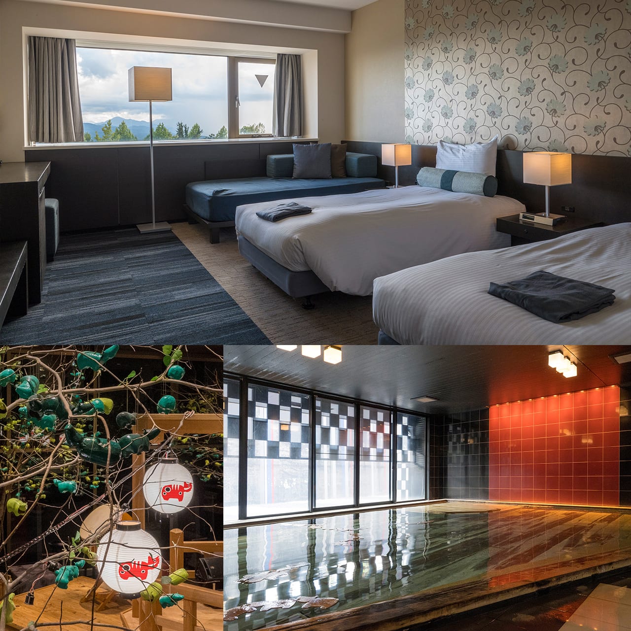 メゾネットタイプや眺望を楽しめる客室、2段ベッドルームなど、リゾートホテルらしい客室もそろいます。5階フロアはすべてメゾネットタイプの客室で、1階がリビング、2階が寝室になっています。会津の地酒をテーマにした「会津モダンスイート」も5階に用意。4階はトリプルで3階はツインの客室です