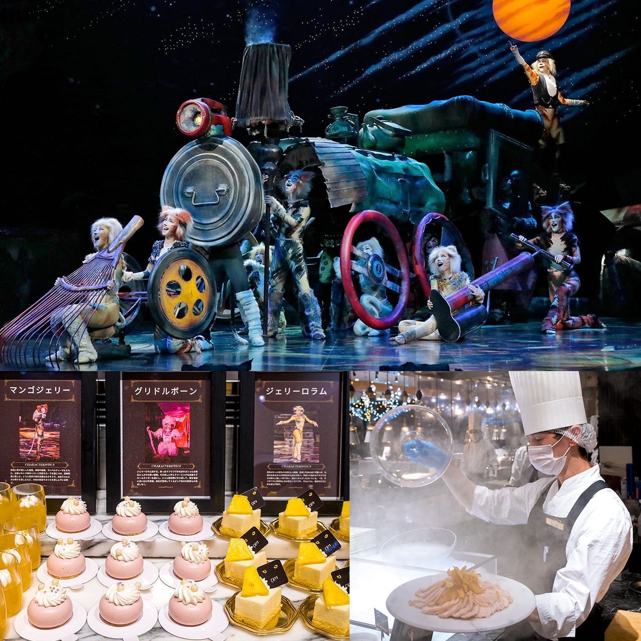 2023年春に続き、今回のランチ&ディナーはリピーターや初めての方でも楽しめるように、一部メニューを残しつつ『キャッツ』に登場する全27匹のキャラクターすべてを、料理やスイーツで表現。シェフやパティシエが、実際に『キャッツ』の舞台を見て考案したメニューは、炎が上がる演出や汽車の煙を模したスモークなども見どころ。トータル34種類の料理やスイーツを用意します。