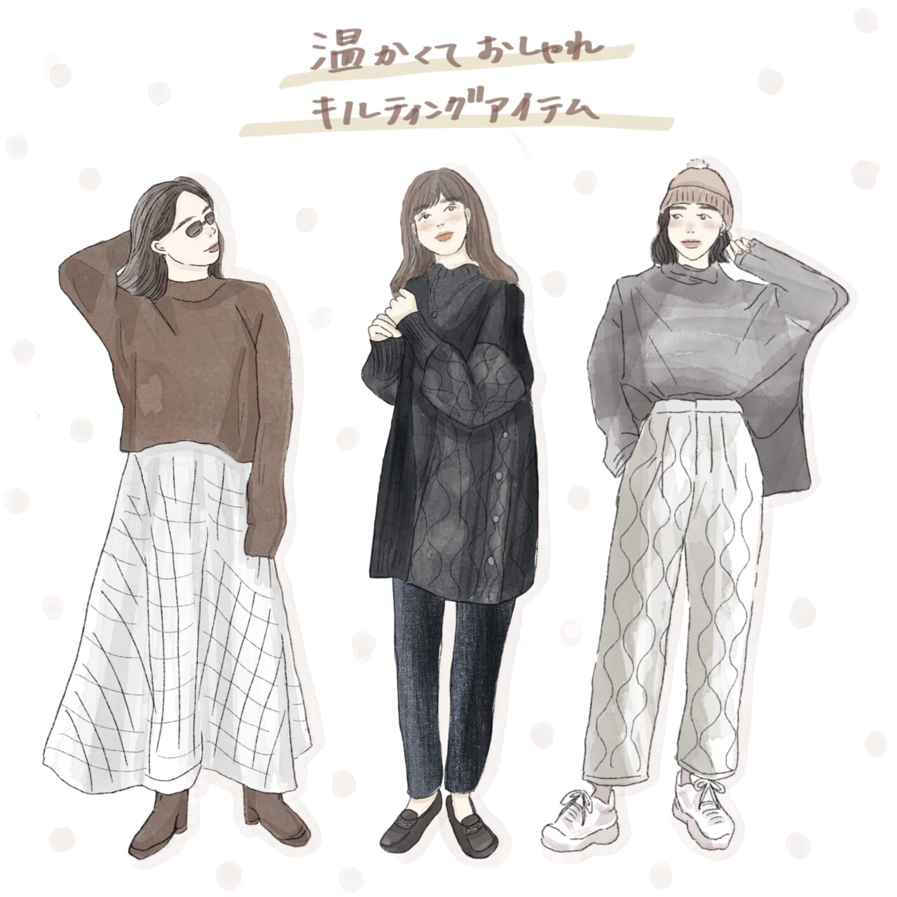 キルティングアイテムというとアウターの印象が強いですが、他のアイテムで採り入れることで、あたたかさはもちろん新鮮な雰囲気を演出できます。ぜひ大人の冬コーデの参考にしてみてくださいね。<illustration:Suzuki Mio(@s.art167)>