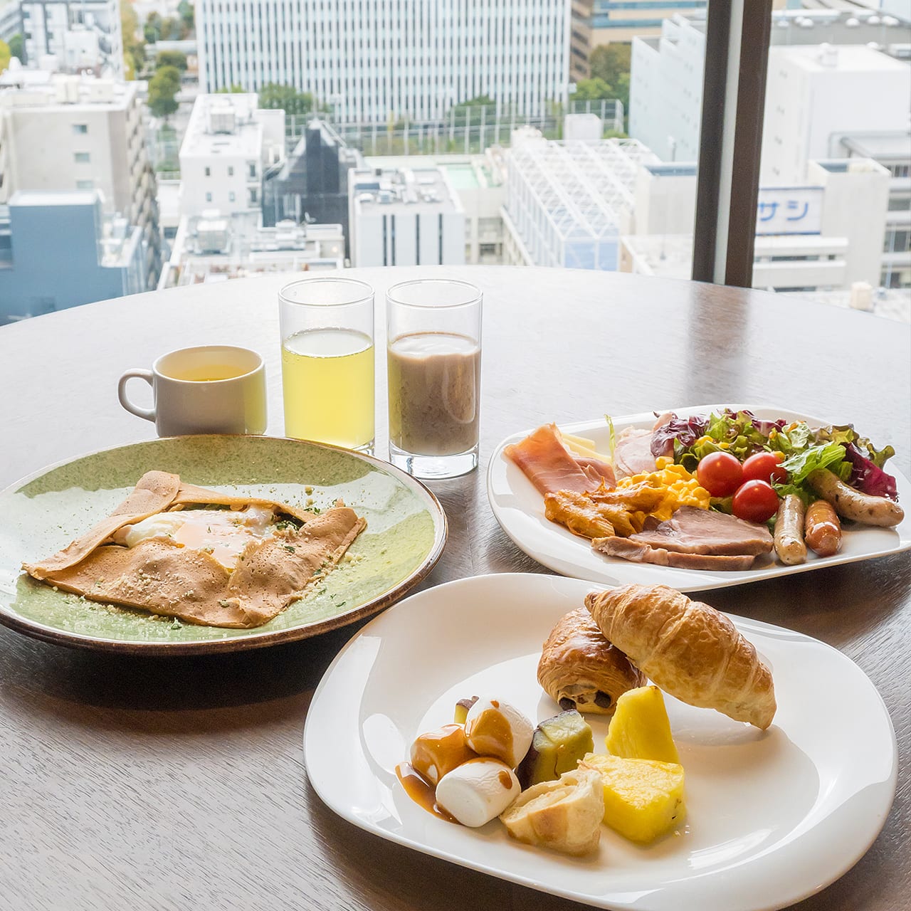 16階の窓から見渡す朝の東京景。銀座8丁目にある【三井ガーデンホテル銀座プレミア】では、景色を楽しみながらの朝食ビュッフェが好評です。レストランのシグネチャーメニュー、美味しいガレットをいただきながら、非日常を味わえる優雅なひと時を楽しめます。