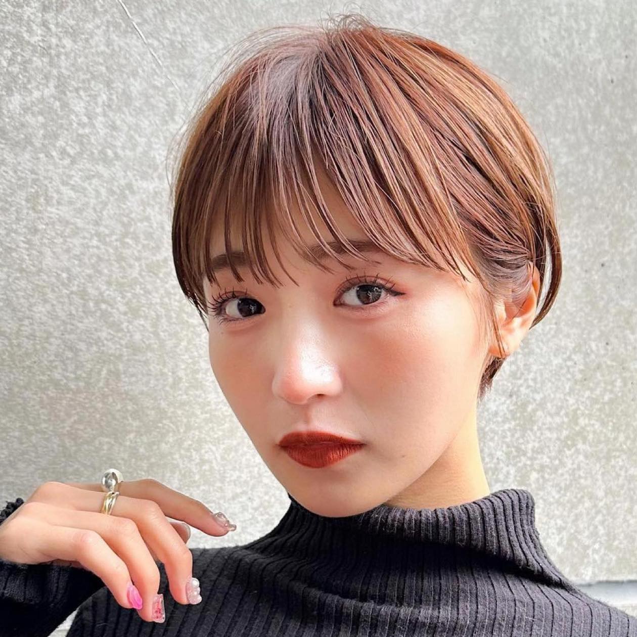 顔に自然な陰影を作れる“長め前髪”のショートヘアは小顔感と目元印象を自然と強調できるのが魅力。