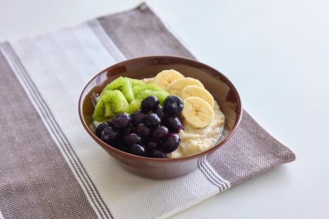 ビフィズス菌入りヨーグルト(無糖):100g、オートミール:40g、甘酒:100ml、バナナ:小1本(80g)、キウイフルーツ:1/2個(50g)、ブルーベリー:50g