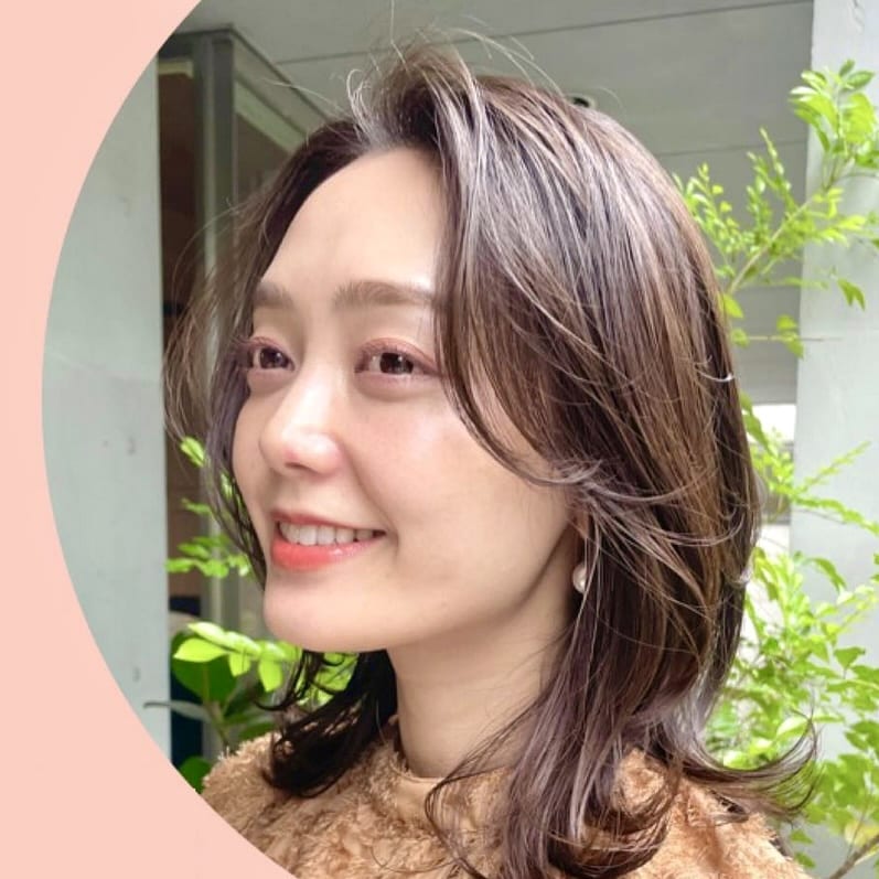 顔の輪郭をふんわりカバーできるひし形シルエットのスタイルは、毛先に向かってレイヤーで丸みを入れていきましょう。また、前髪を作らずに顔周りに入れたレイヤーを活かすように後れ毛を残すと目元印象が強調され、正面から見てもサイドから見てもフェイスラインを引き締まった印象に見せることができます。