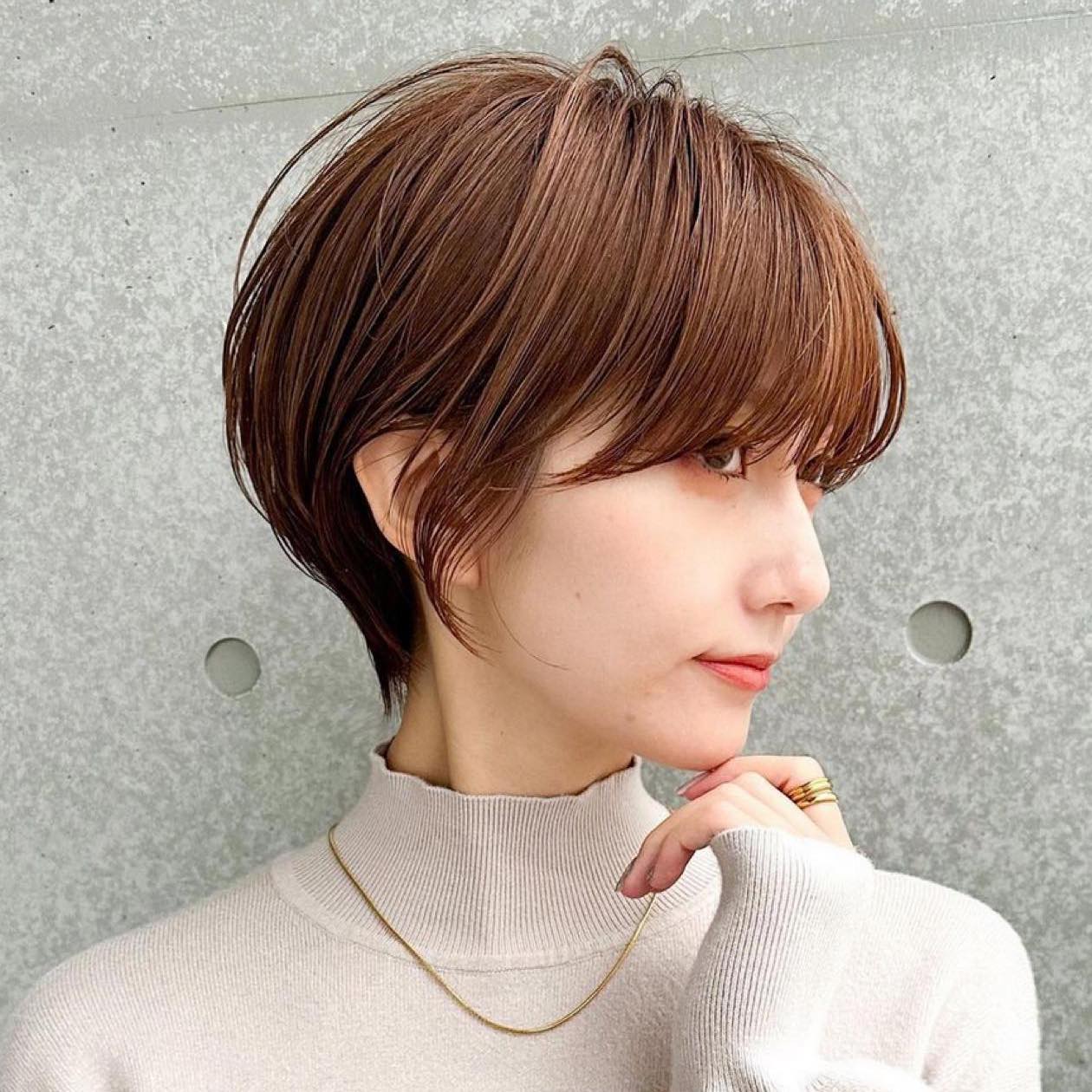 前髪長めの丸みシルエットのショートヘアは襟足をスッキリさせることでシャープさを演出。透明感の高いヘアカラーでさらなる軽さを出せば、全体の印象がコンパクトにまとまり、自然と小顔見せが叶います。また、耳出しと柔らかなスタイリングでオンナっぽさをさり気なくアピールするのもポイントです。