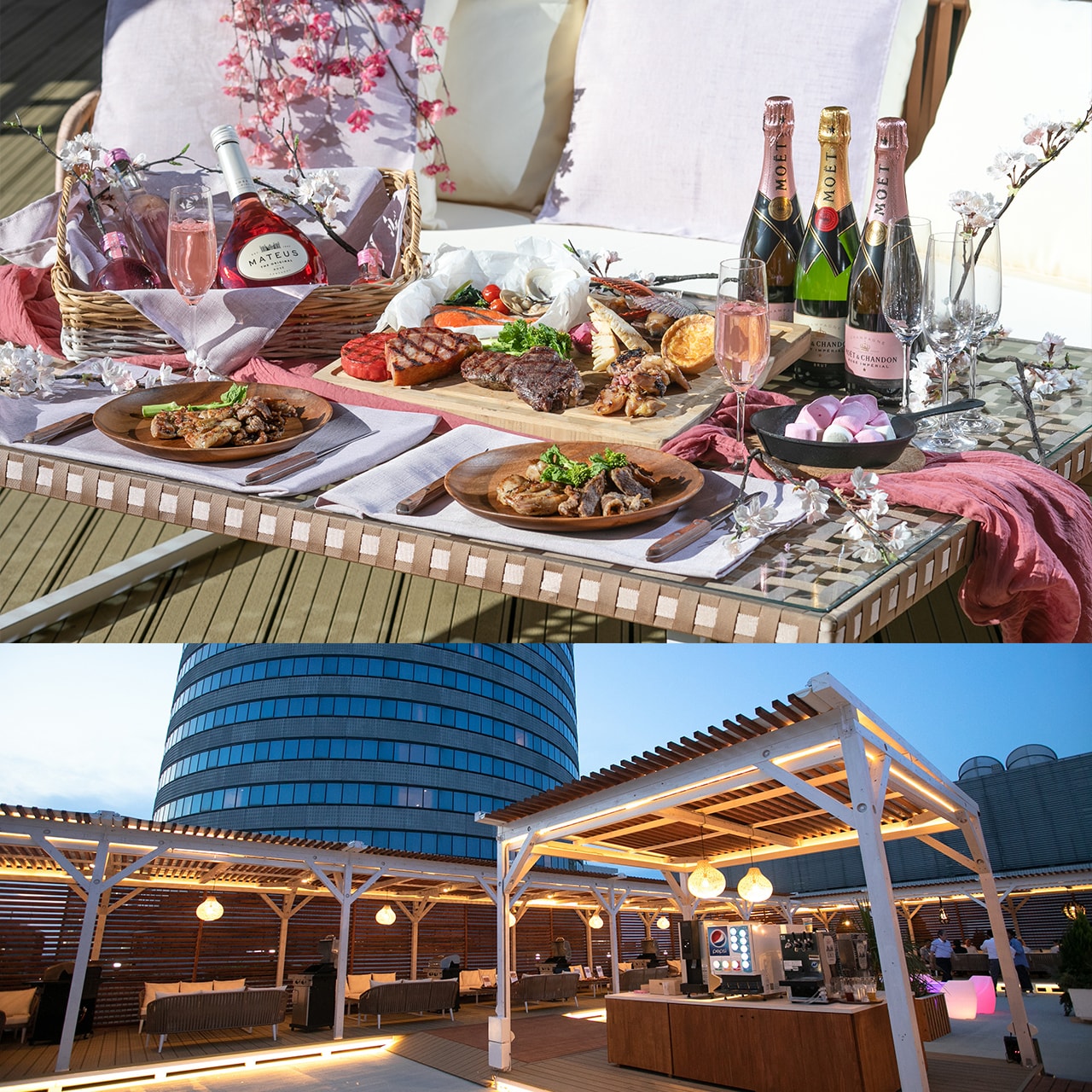 さくら花塩漬けの鶏もも肉や、春野菜のグリル、さくらのマシュマロなど春を感じる食材を用意。モエ・エ・シャンドン モエ ロゼ アンペリアなどさくら色のお酒(有料)も用意され、お花見気分を楽しめるプランです。